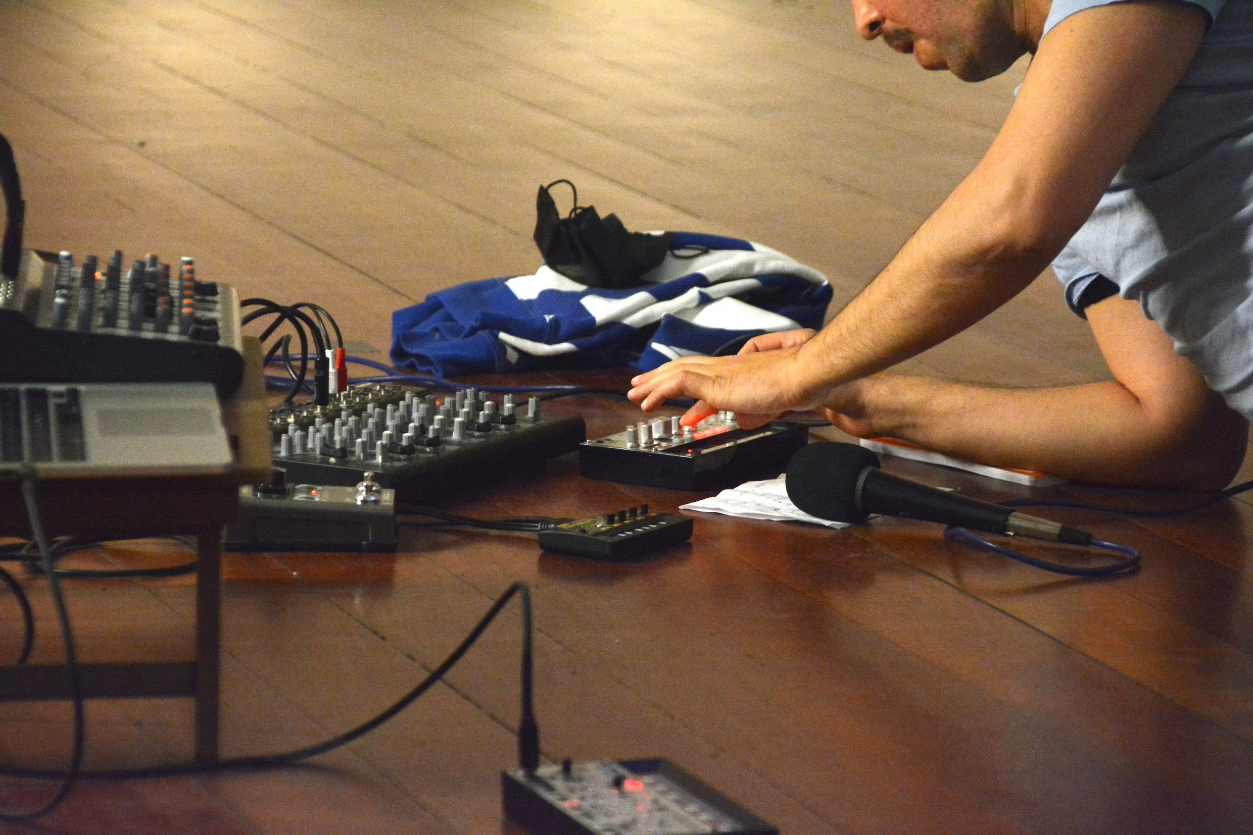 Sigo escuchando esa música, esa canción de The Doors, pero esta vez le quito la letra de la canción. Solo escucho la versión instrumental. La dejo que corra unos segundos, que me impregne de su esencia. Poco a poco la voy distorsionando con uno de los sintetizadores, hago que existan ecos de la propia canción, ecos que se van acoplando hasta hacer inteligible la música original. Me muevo por el espacio. Inhalo y exhalo, a veces escucho notas de la canción y entro en esa cadencia de movimiento. Después de un par de minutos vuelvo a la mesa de sonido. Incorporo un sonido de pájaros mientras dejo de fondo el ruido producido por la distorsión de la canción. También incorporo un sonido ambiente de personas caminando. Camino por el estudio, camino, salto, corro un poco, bajo y subo de nivel mientras me desplazo en diferentes direcciones. Digo una frase al micrófono “la naturaleza sólo permite un desarrollo muy lento”, la loopeo y comienza a sonar repetidamente. Sigo en movimiento. Esta vez me quedo quieto y comienzo a caminar a cámara lenta. Siento ese ritmo dentro de mí. Siento esa práctica ralentizante. Poco a poco voy acelerando, acelero, me muevo rápido, piernas, brazos, cabezas, siento el riesgo, me puedo caer, voy de un lado al otro de la habitación, me canso, me agoto, vuelvo a la mesa y distorsiono la voz hasta que no se escucha. Con otro sintetizador voy creando un ritmo. Poco a poco voy pulsando el teclado y se va formando una pauta que se repite, la dejo que suene, me estimula el baile techno, el baile de discoteca que puedo hacer en un metro cuadrado. Repito varias frases para que se incorporen al ambiente sonoro: “¿Dónde estamos? Se va tan rápido que todo parece igual”.